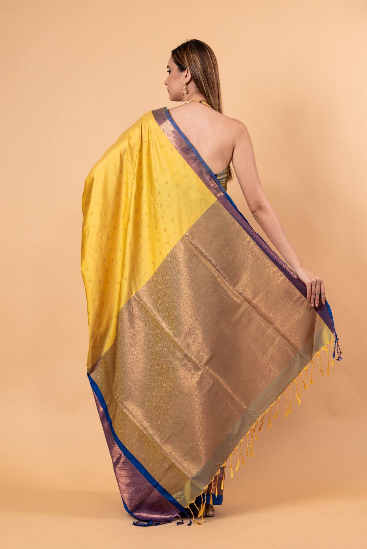 Shop this exquisite Yellow Gadwal Silk Saree with contrasting blue and gold zari work. Perfect for Indian women seeking elegance and tradition. Includes unstitched blouse!