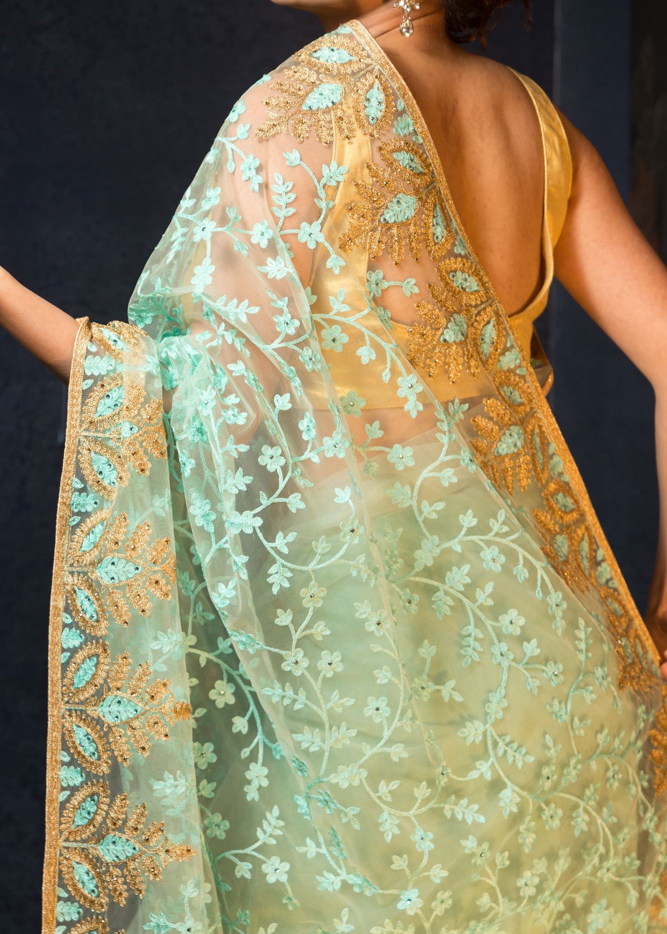 Pastel net sarees create soft elegance with light, soothing colors. These sarees in shades like blush pink, mint green color net saree, and powder blue are ideal for a day event or an intimate get-together. The airy fabric combined with soft hues creates a timeless look of grace, offering a sophisticated appeal to any occasion.