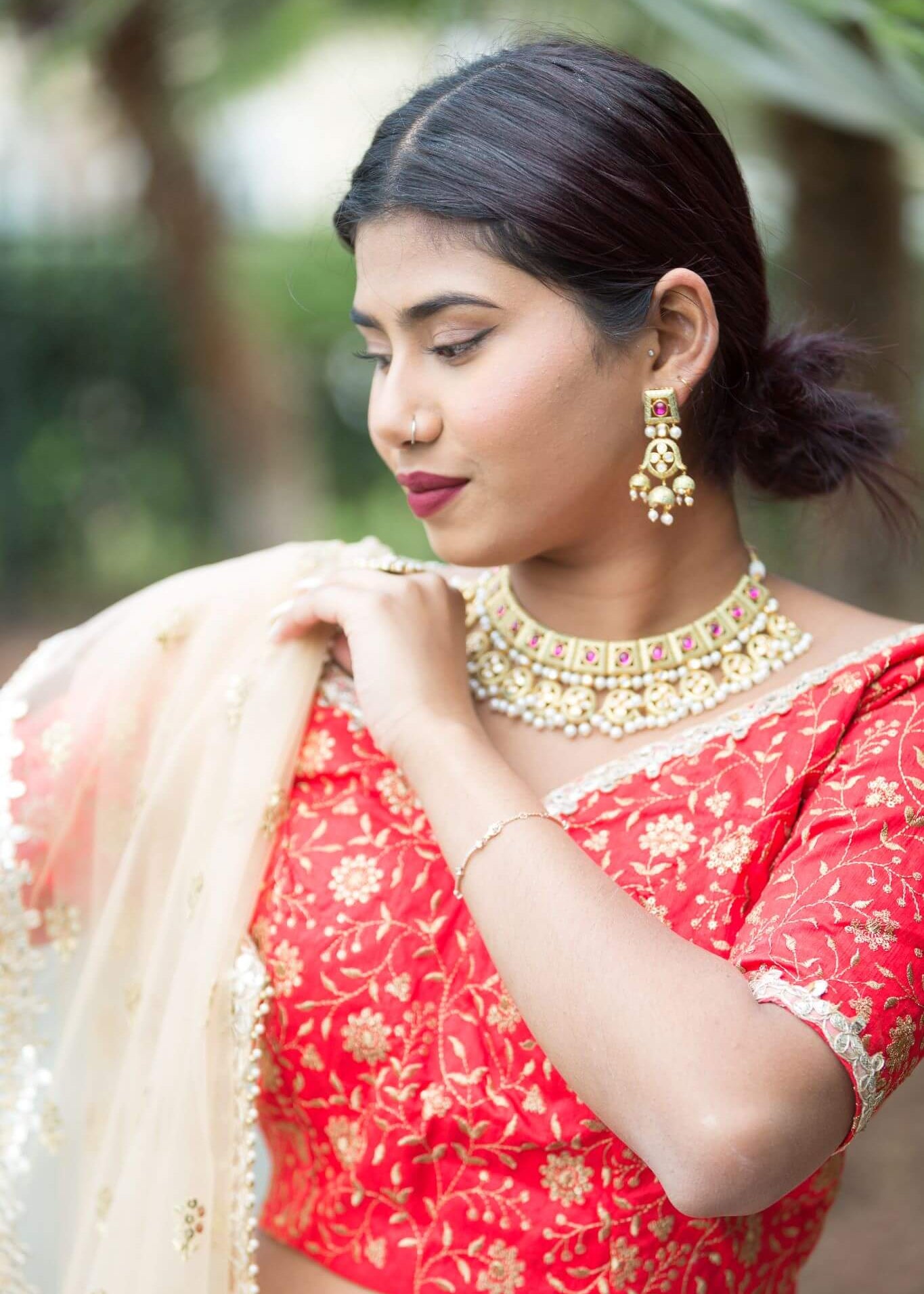 Gold, silver, or diamond jewelry is the best pairing when styling a red lehenga. Choker sets, maang tikka, jhumkas, and bangles are some of the traditional options that go along well with the rich color of the lehenga. Remember, the jewelry should support the overall look rather than overpower it to create an ideal outfit.
