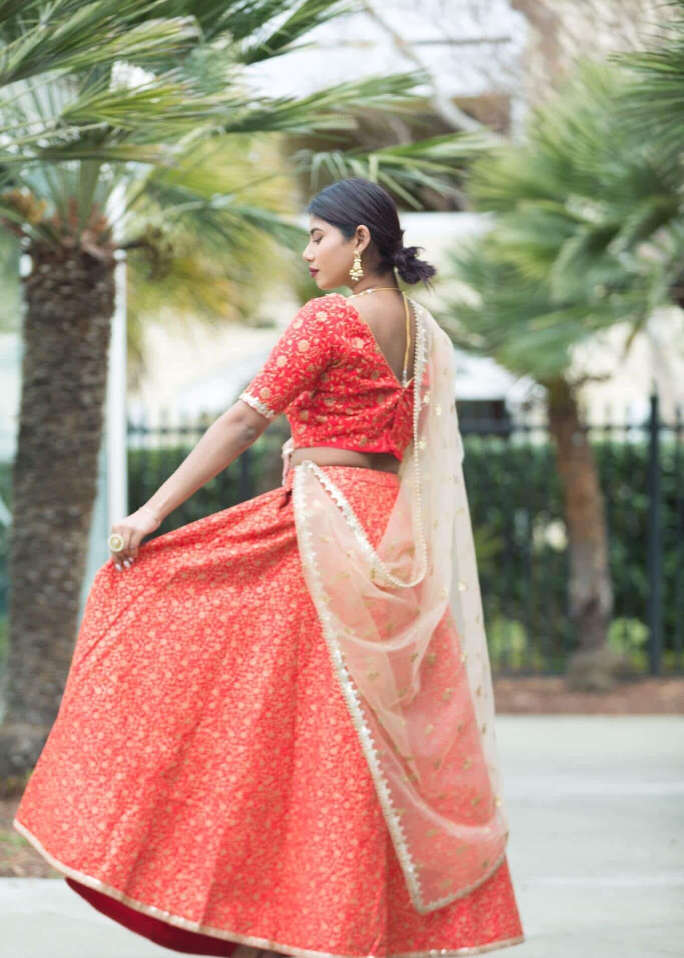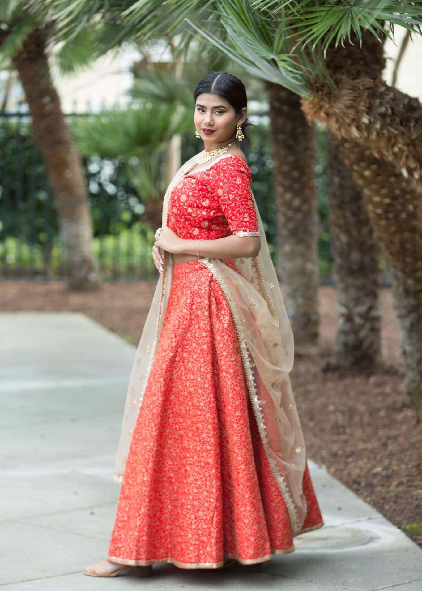 Lehengas are available in many different shades, including bright crimson, scarlet, and ruby, and also in deeper tones such as maroon, burgundy, and wine. If the occasion is a daytime event, coral and tomato red can be good options, whereas darker reds can be suitable for evening events.