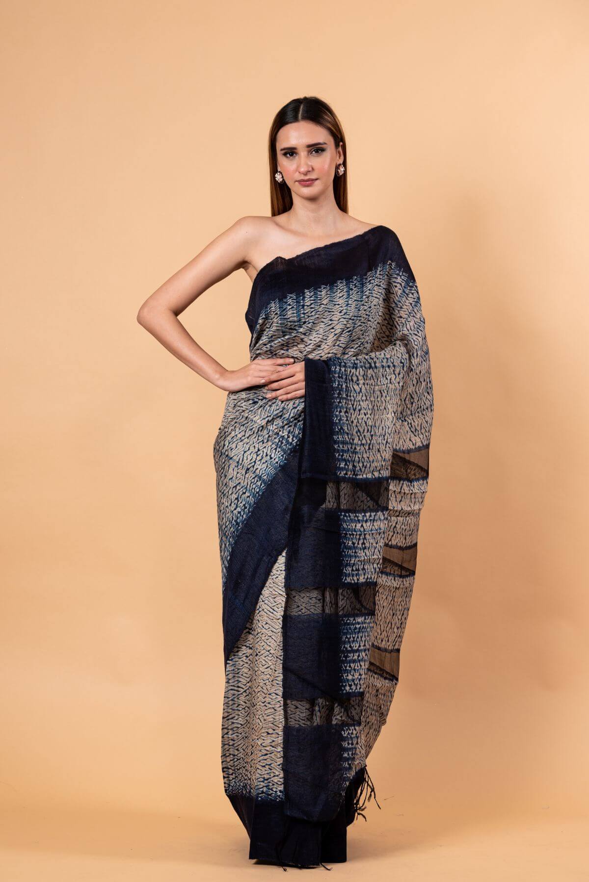Explore our exquisite Blue & White Shibori Handloom Saree made from pure Matka silk. Perfect for saree lovers seeking elegance and handcrafted artistry. Shop now!