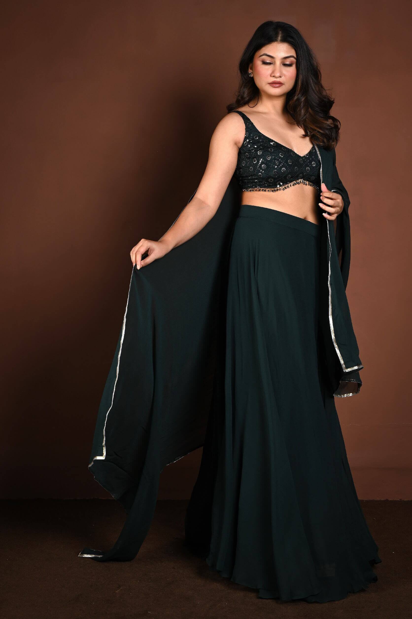 Dark Green Embroidered Lehenga Set in Georgette with Matching Dupatta