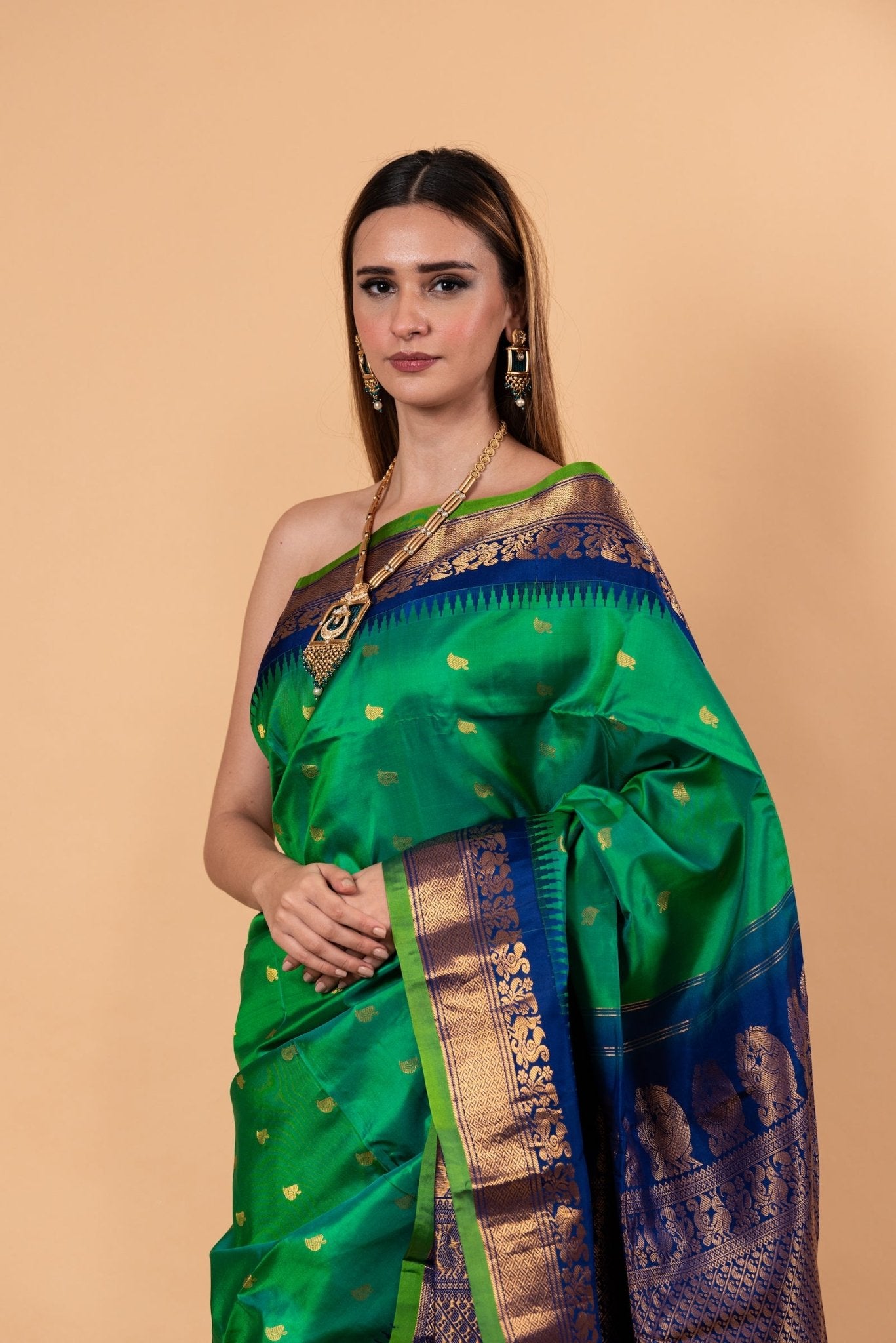Elevate your traditional wardrobe with this luxurious emerald green saree crafted in authentic gadwal pure silk saree fabric. The rich emerald green hue exudes royal elegance and festive charm, making it a perfect choice for weddings, temple ceremonies, cultural events, and grand celebrations.