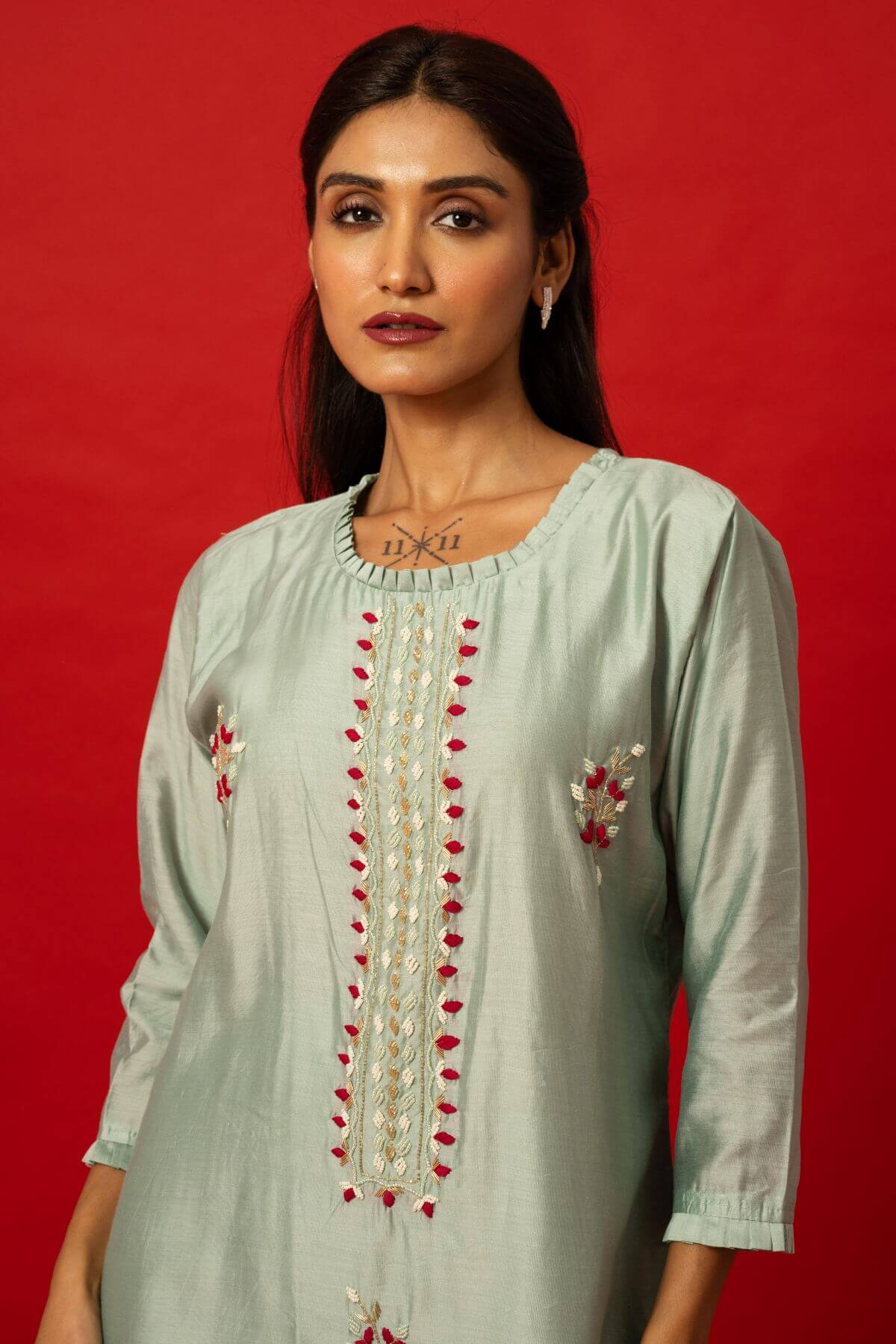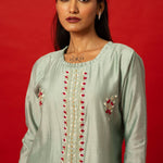 Elevate your ethnic wardrobe with this embroidered silk Kurti set, showcasing expert attention to detail. This set includes palazzo pants and a coordinating dupatta for a regal appeal. Perfect for festive occasions, weddings, or formal celebrations, the soft silk fabric offers a comfortable and sophisticated drape. The light blue hue complements a variety of skin tones.
