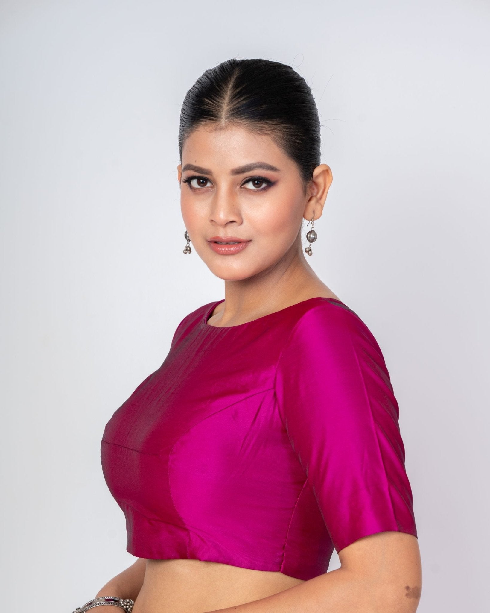 Magenta Boat Neck Silk Blouse with Round Back Closure & Elbow Sleeves