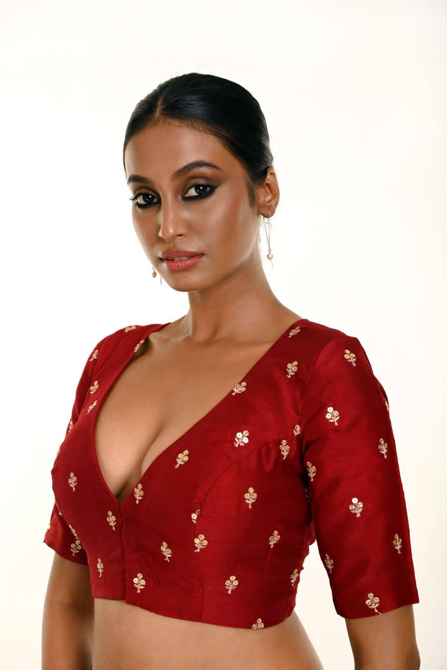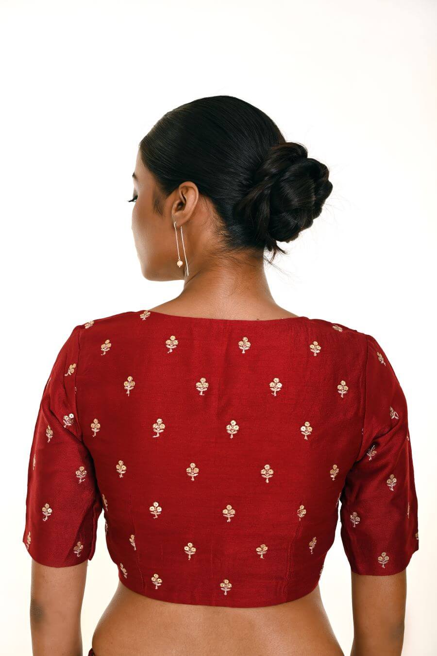 Stun in style with this Maroon Pure Silk Resham Boota Embroidered Blouse featuring a V neckline.