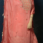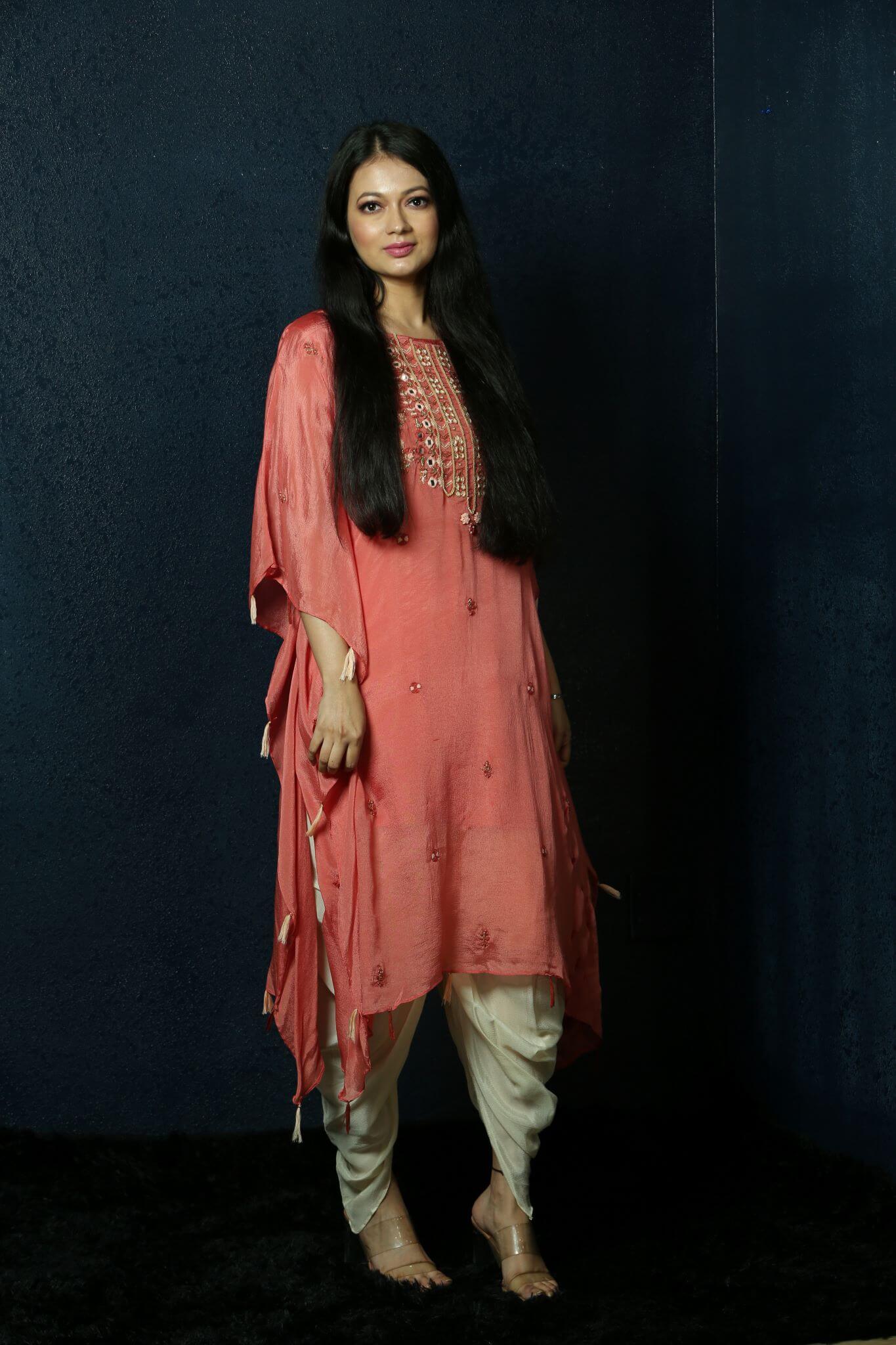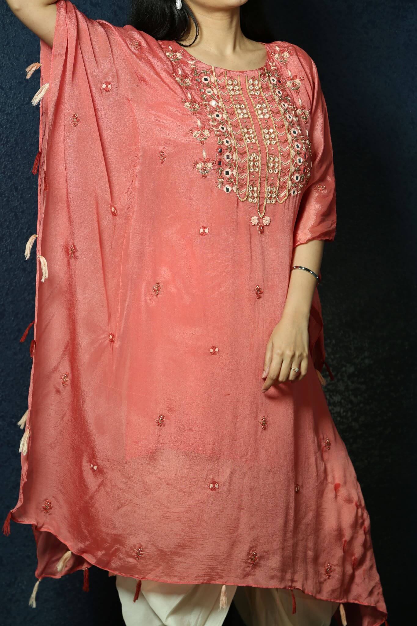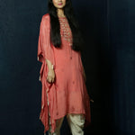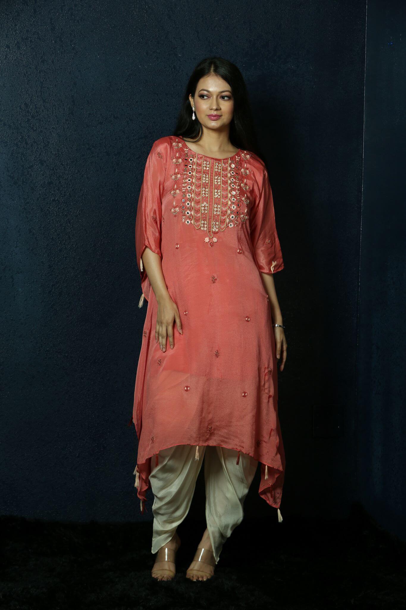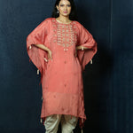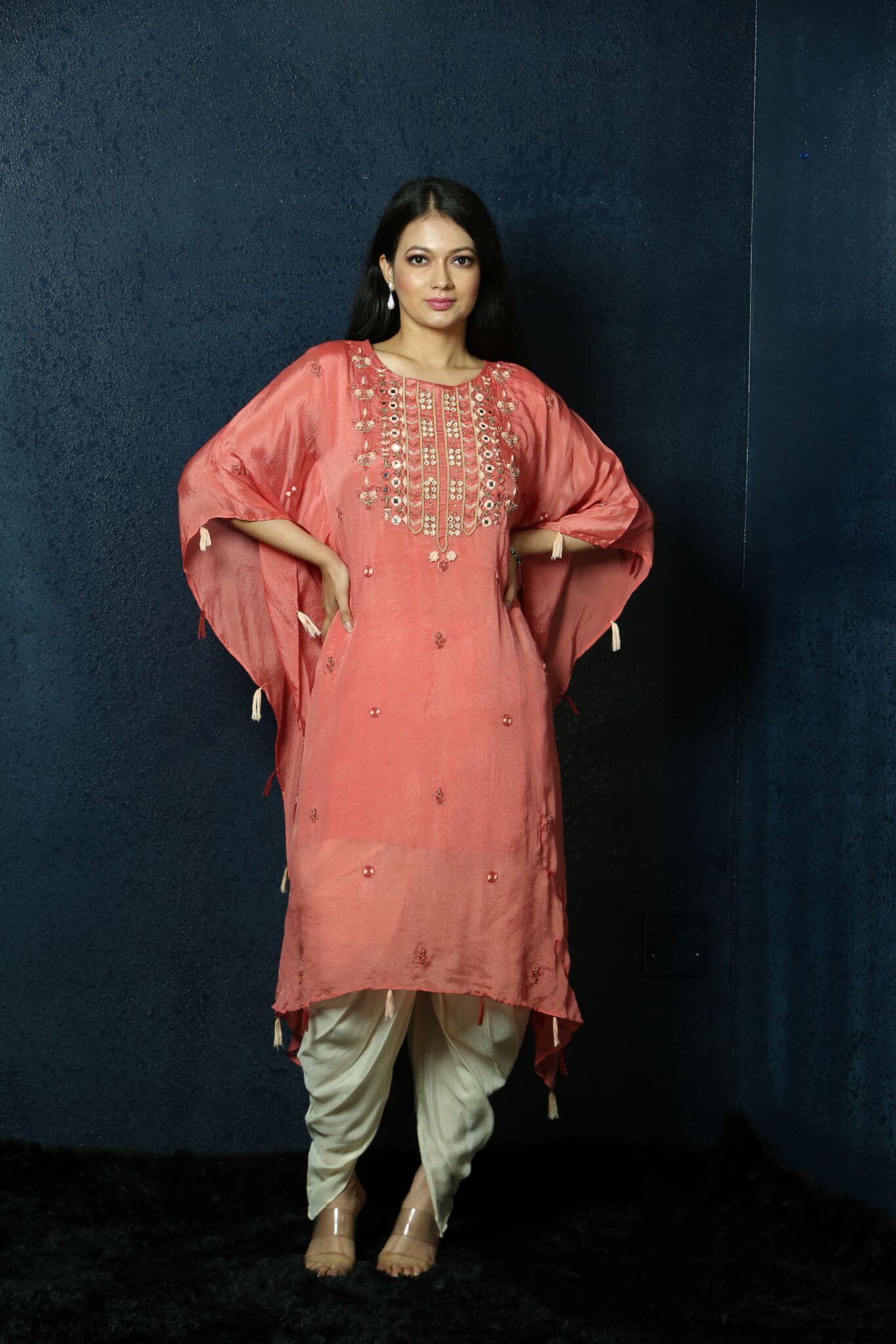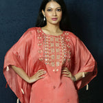 This beautiful Peach Kaftan Dress features elegant Handwoven Embroidery and comes with a matching Dhoti Pant. Enjoy effortless style and comfort with this chic and sophisticated ensemble.