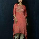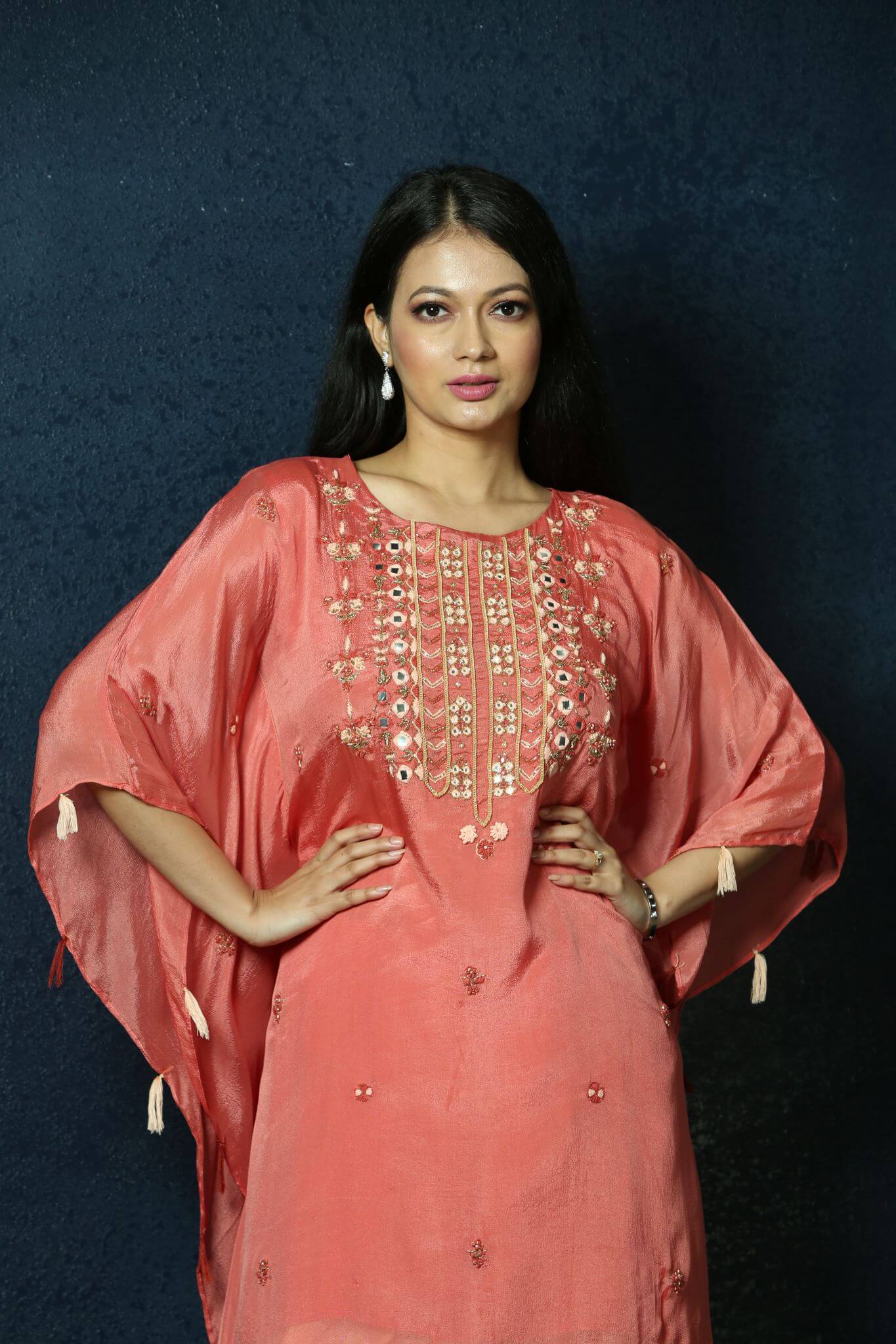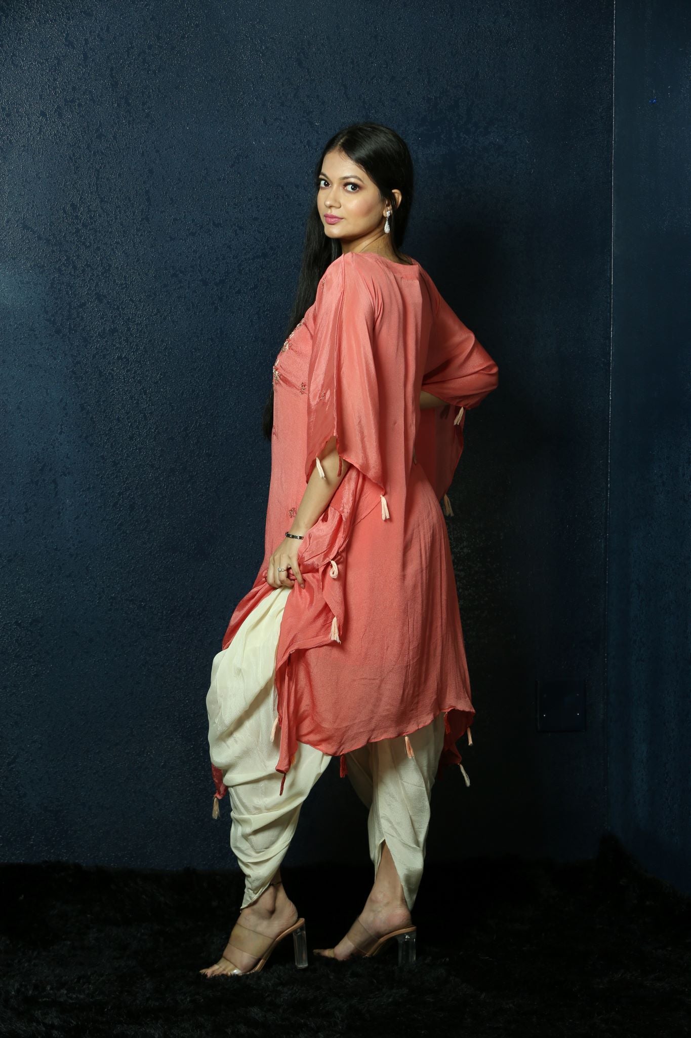 Peach Kaftan Dress Embellished With Handwoven Embroidery And Dhoti Pant