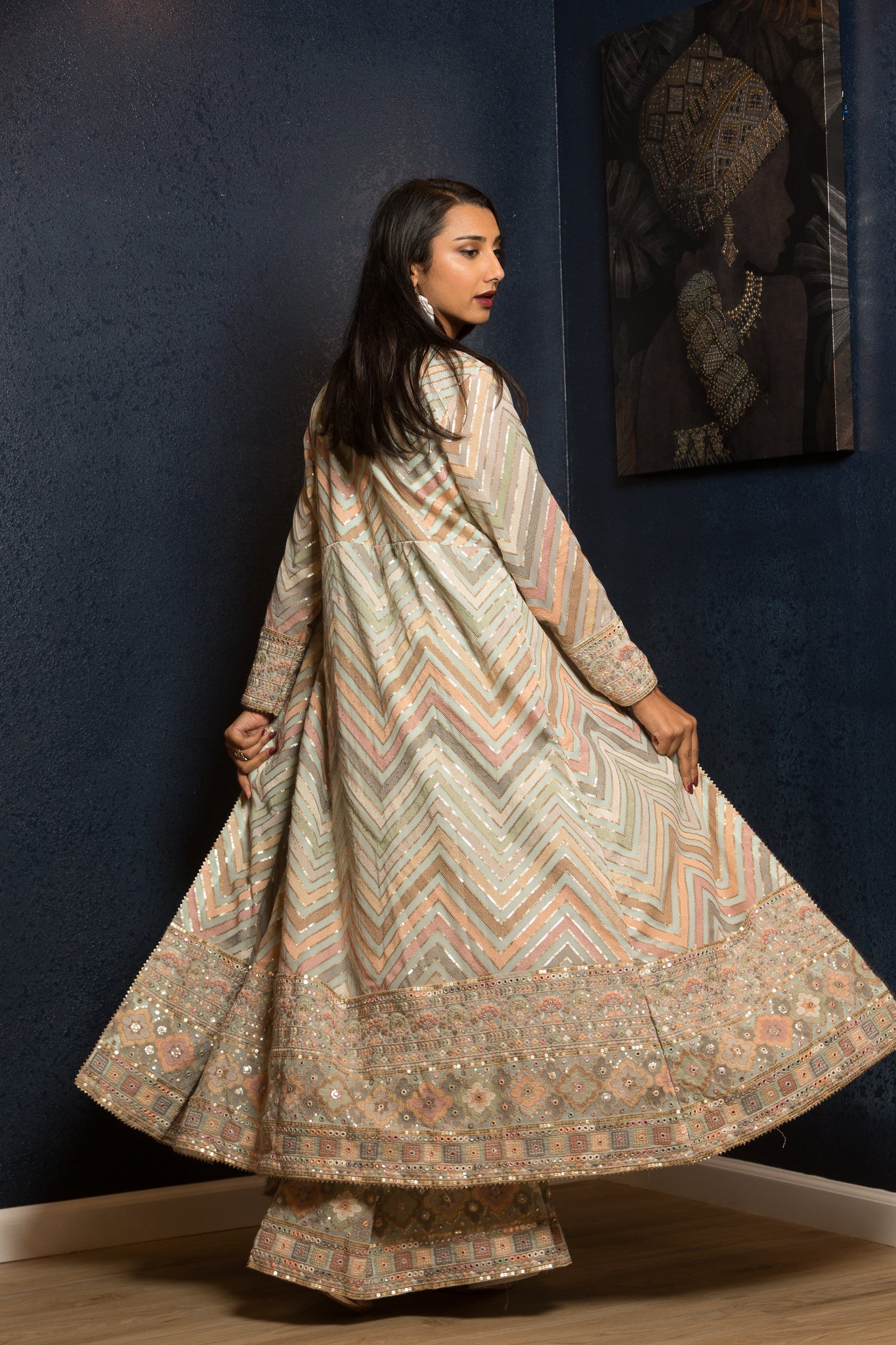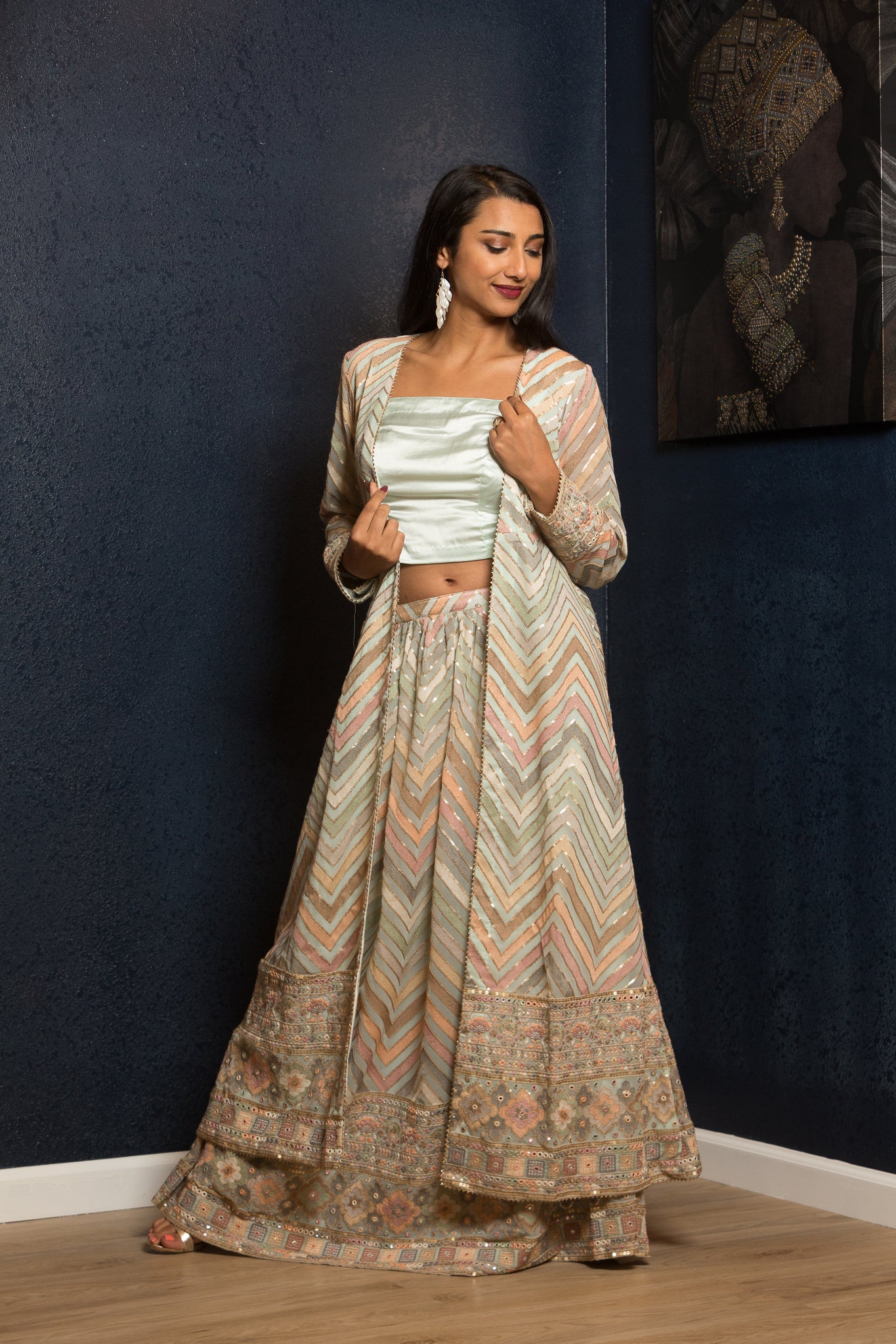 Multi Color Designer Long Jacket Lehenga Set in Georgette