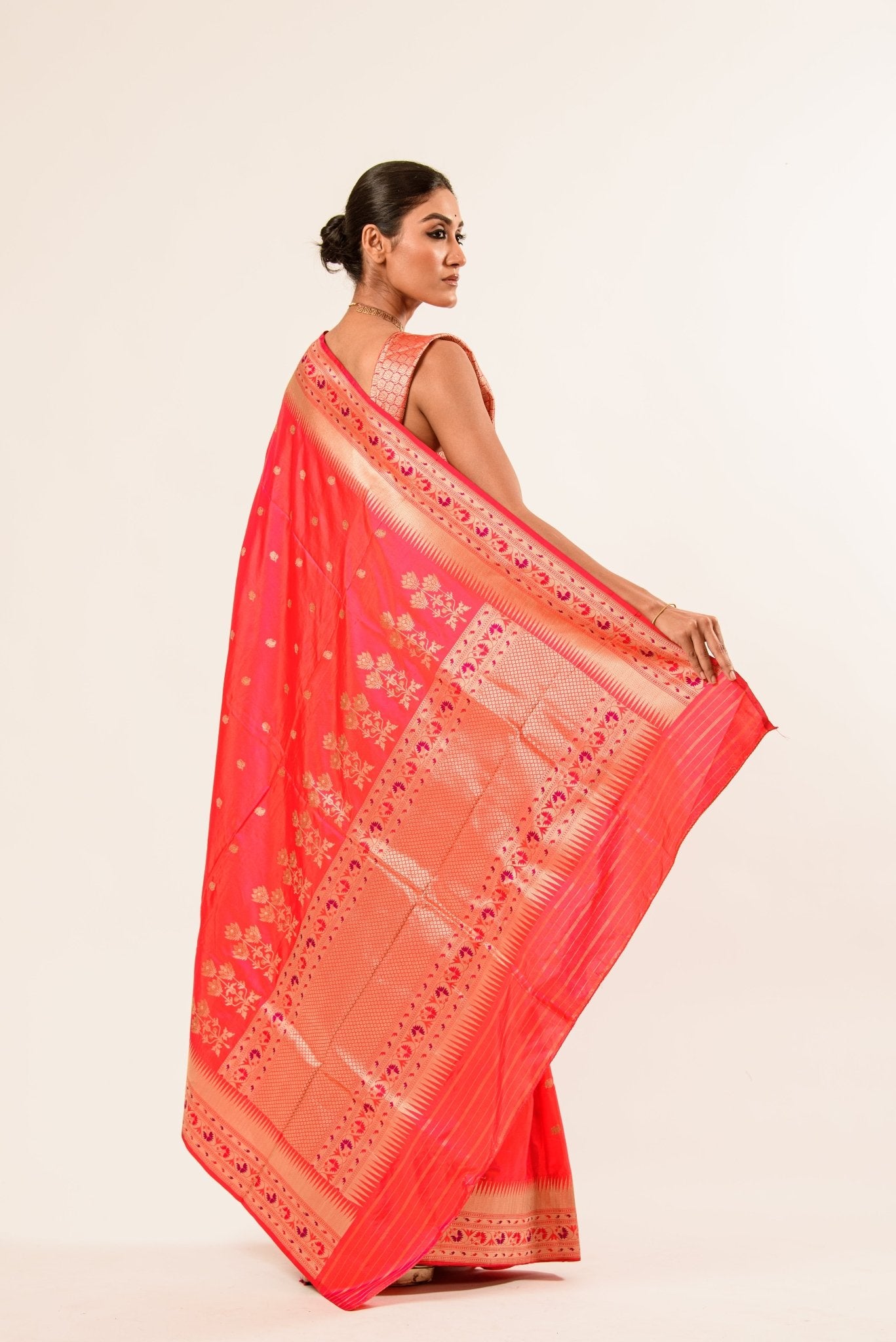Woven in premium Katan silk, the saree offers a smooth texture, rich sheen, and structured drape that enhances your silhouette effortlessly. The intricate handwoven patterns reflect heritage craftsmanship, adding depth and regal elegance to the overall design. Its refined finish and vibrant detailing make it a standout piece in any ethnic collection.