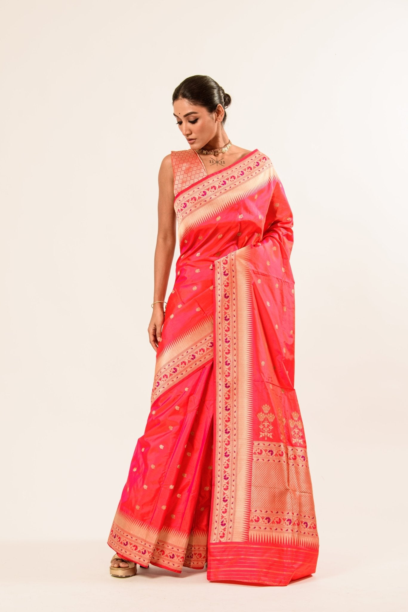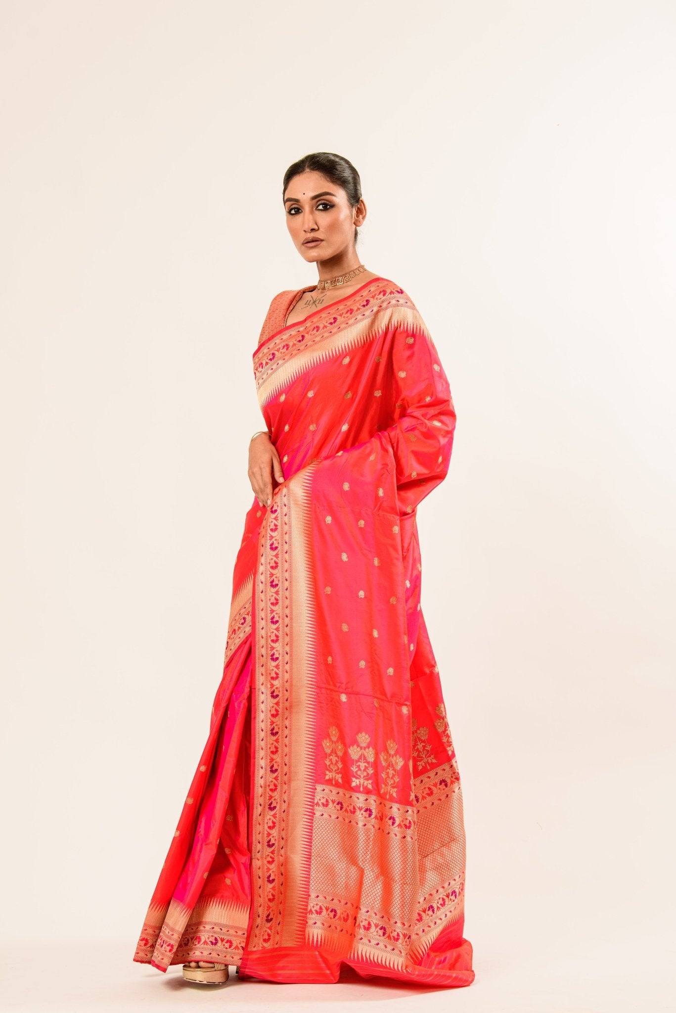Style it with traditional gold jewelry and a contrasting silk blouse for a majestic festive look, or keep it minimal for understated sophistication. This saree is a timeless investment that celebrates culture, artistry, and refined luxury.