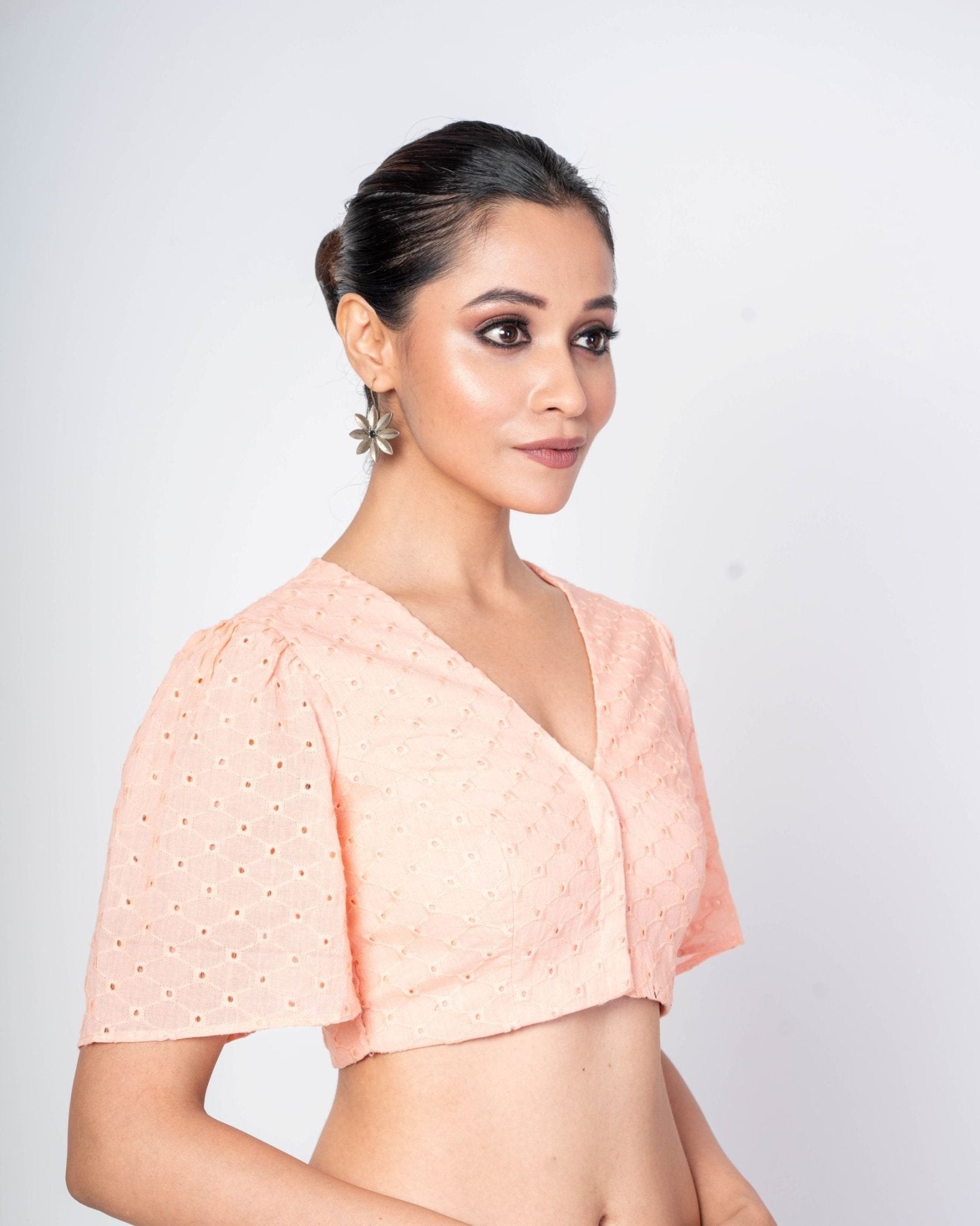 Add a soft and elegant touch to your ethnic wardrobe with this beautiful peach blouse featuring a flattering V-neckline and a stylish back closure. Designed in delicate Hakoba pattern, it gives a classy and feminine look that is perfect for festive occasions, casual outings, and daytime celebrations. The V-neck design enhances your neckline beautifully, while the secure back closure ensures a comfortable fit with a neat finish. Lightweight and breathable, this blouse pairs effortlessly with sarees, lehengas, and skirts for a graceful ethnic style. The soothing peach shade adds a fresh and trendy charm, making it a must-have for modern traditional fashion lovers. Crafted from premium cotton blouse fabric, it offers all-day comfort, softness, and a smooth feel on the skin. Style it with minimal jewelry for a simple look or accessorize it for a festive vibe.