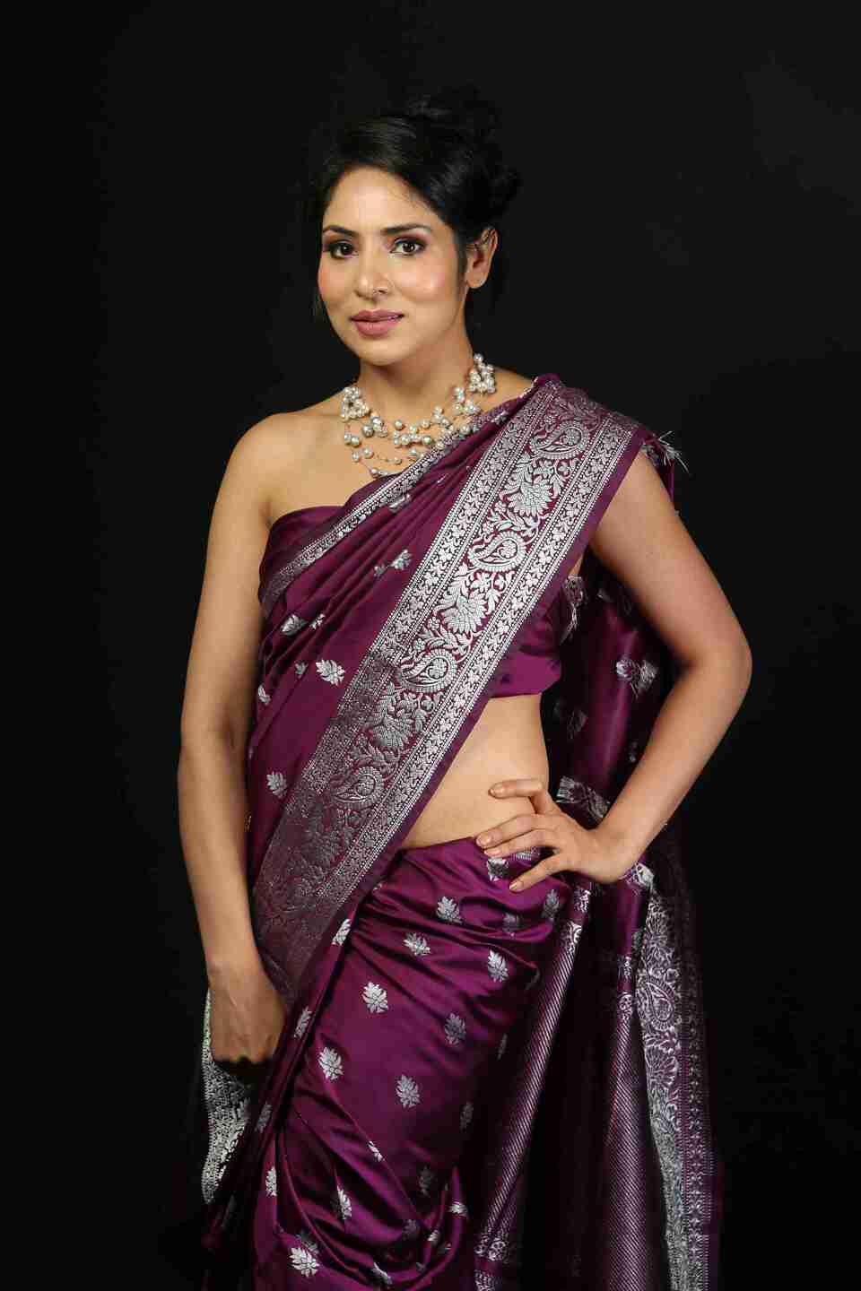 Wine Purple Silk Saree with Silver Motifs and Brocade