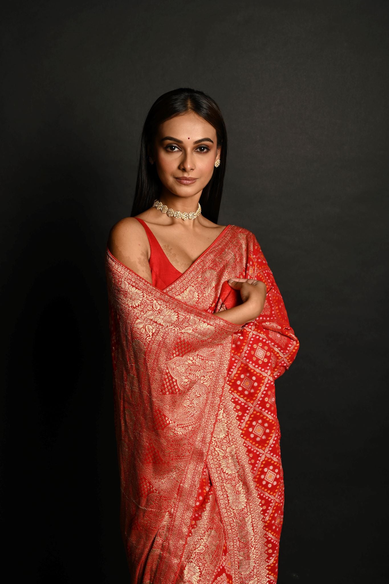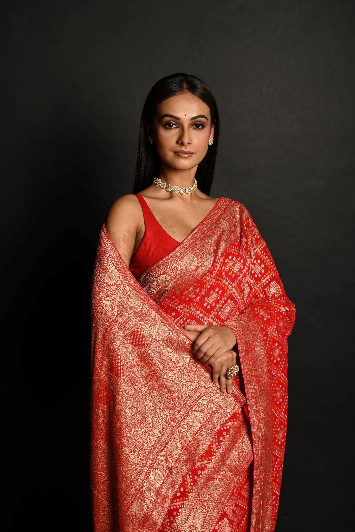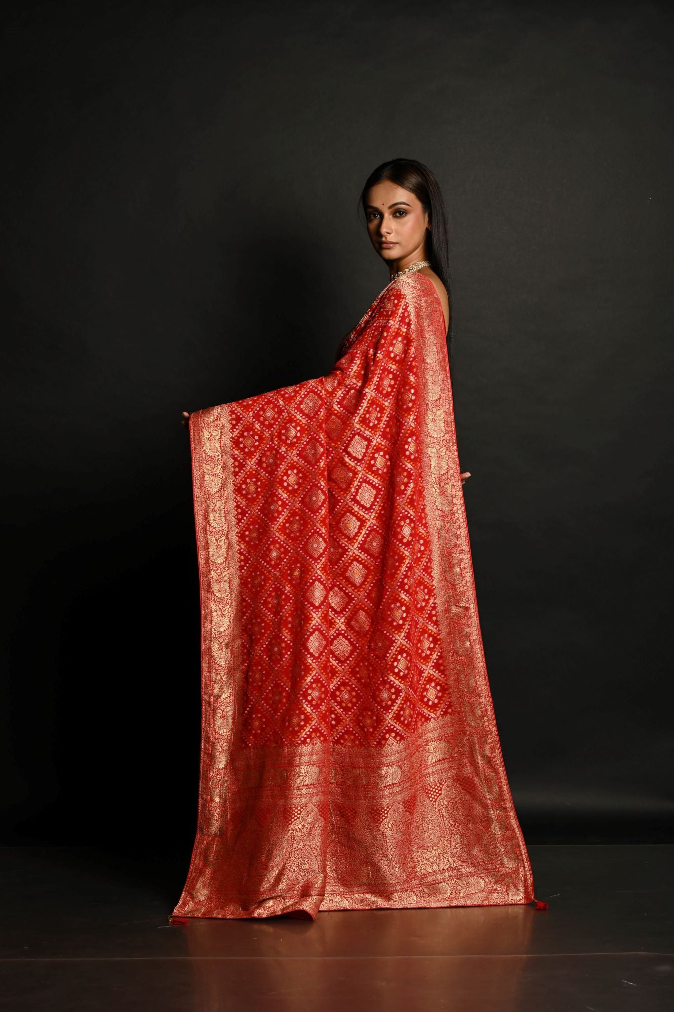 Introducing the Red Georgette Banarasi Bandhani Handloom Saree—a masterpiece of traditional artistry. This stunning saree combines the rich heritage of Banarasi weaving with the intricate patterns of Bandhani, creating a mesmerizing look. The vivid red hue beautifully complements the delicate motifs, making it an ideal choice for weddings, festivals, and special occasions. Draping this saree is like wearing a piece of art, crafted with care and precision to ensure you stand out with timeless elegance.