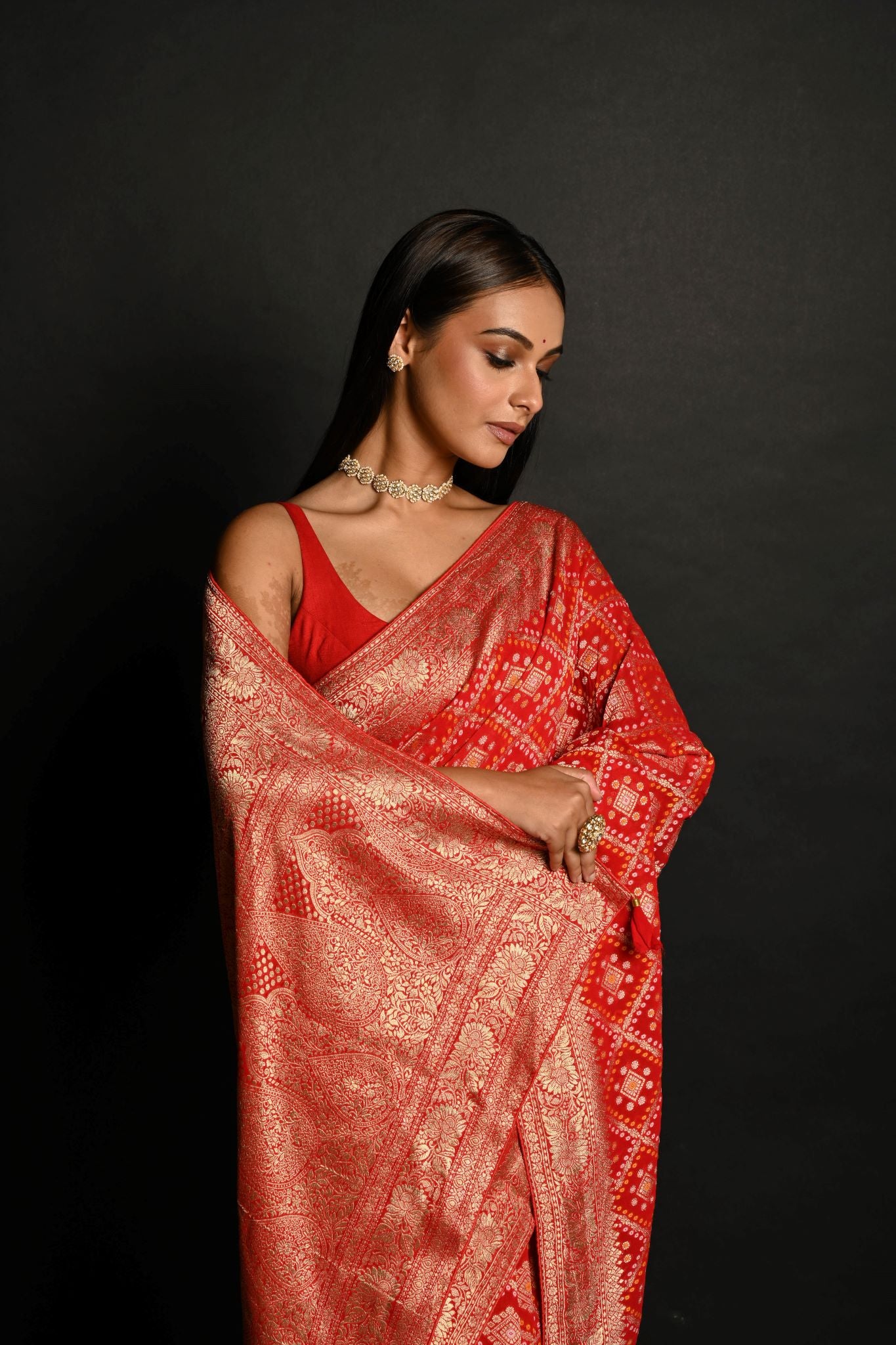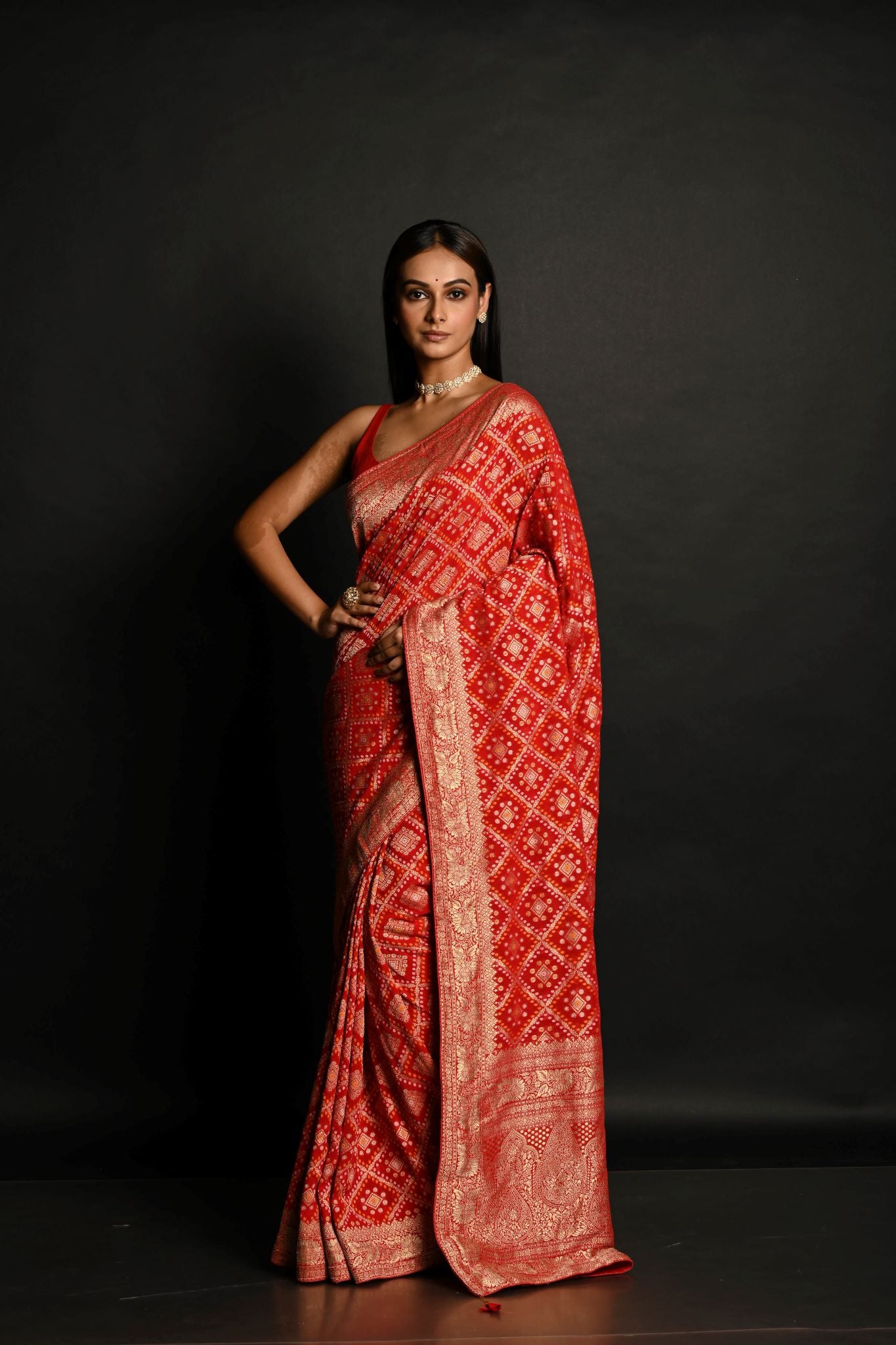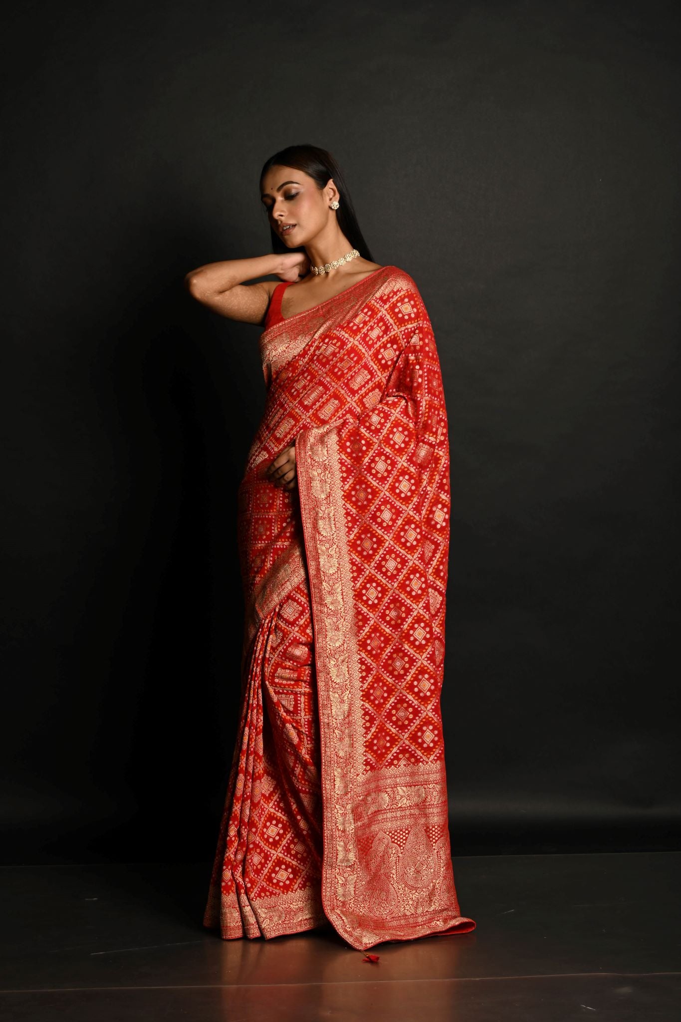 Introducing the Red Georgette Banarasi Bandhani Handloom Saree—a masterpiece of traditional artistry. This stunning saree combines the rich heritage of Banarasi weaving with the intricate patterns of Bandhani, creating a mesmerizing look. The vivid red hue beautifully complements the delicate motifs, making it an ideal choice for weddings, festivals, and special occasions. Draping this saree is like wearing a piece of art, crafted with care and precision to ensure you stand out with timeless elegance.