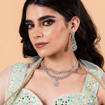 This eye-catching necklace and earring set is the perfect accessory to spice up any outfit. Featuring a dazzling silver design and intricate floral pattern, the two-stranded necklace and long, coordinating earrings make a stunning statement.