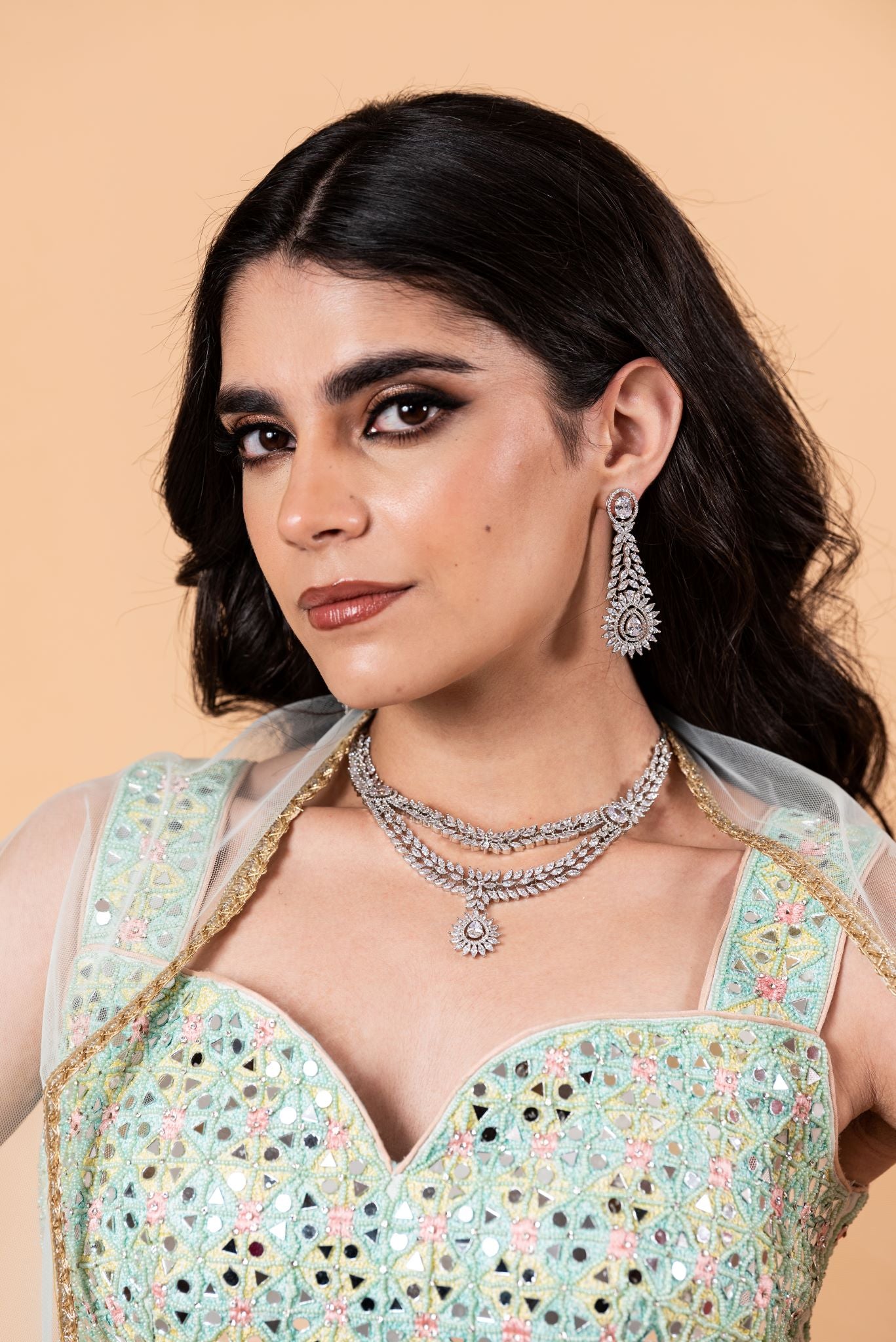 Dazzling Silver Floral Two Stranded Necklace and Earring Set