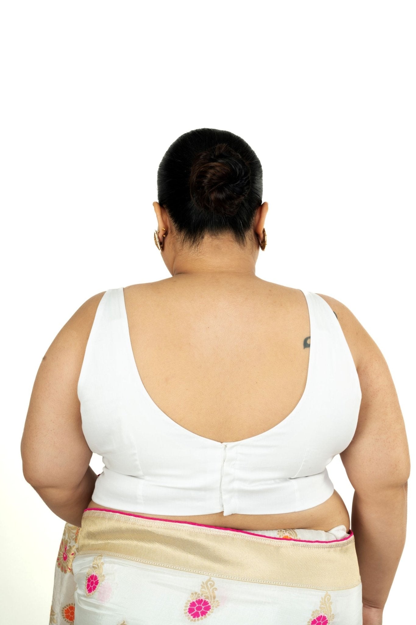 Crafted in premium cotton silk, this white plus size blouse features a classic square neckline and sleeveless design for a modern, versatile look. Comfortable and chic, it pairs effortlessly with sarees for festive occasions, parties, and everyday elegance.