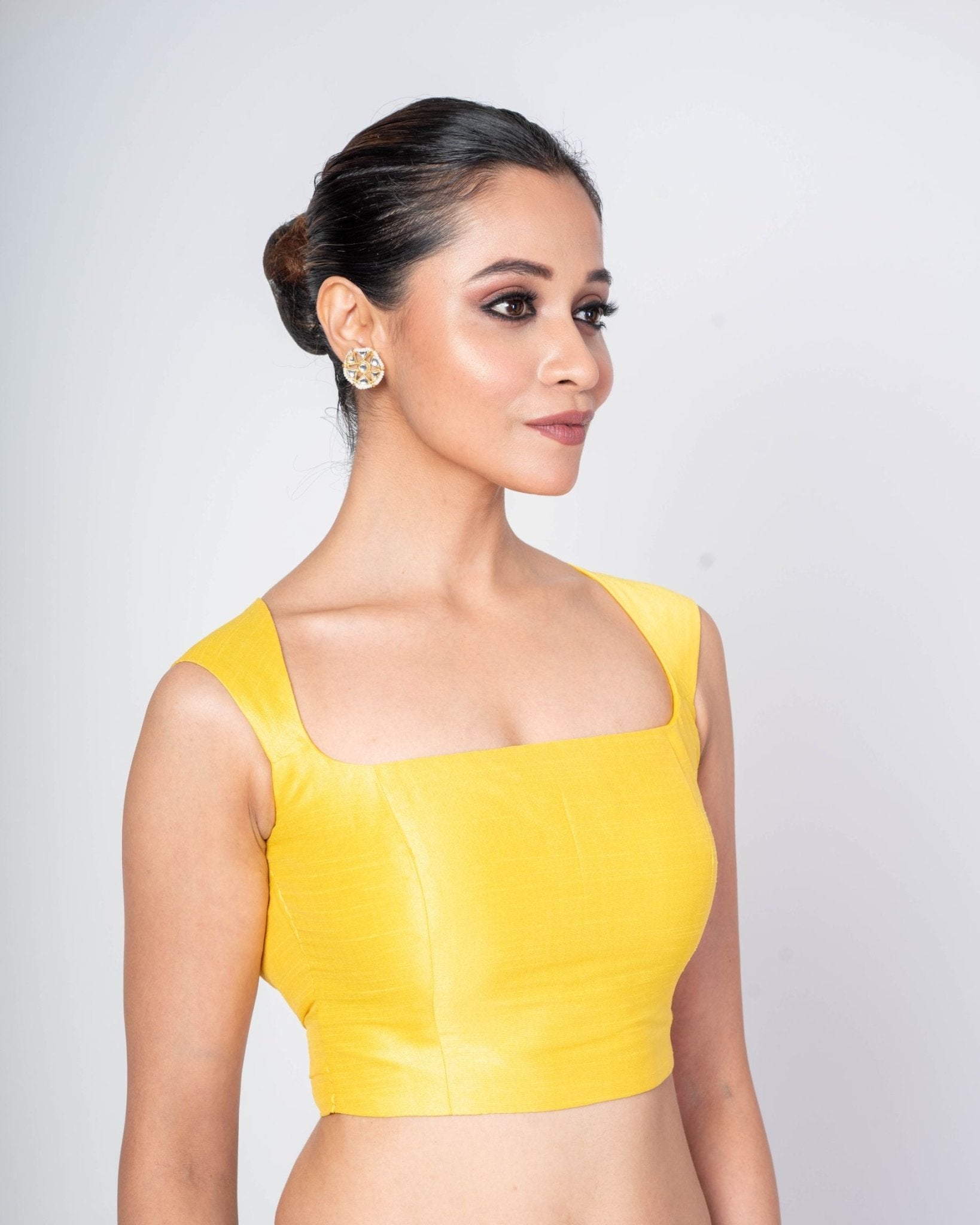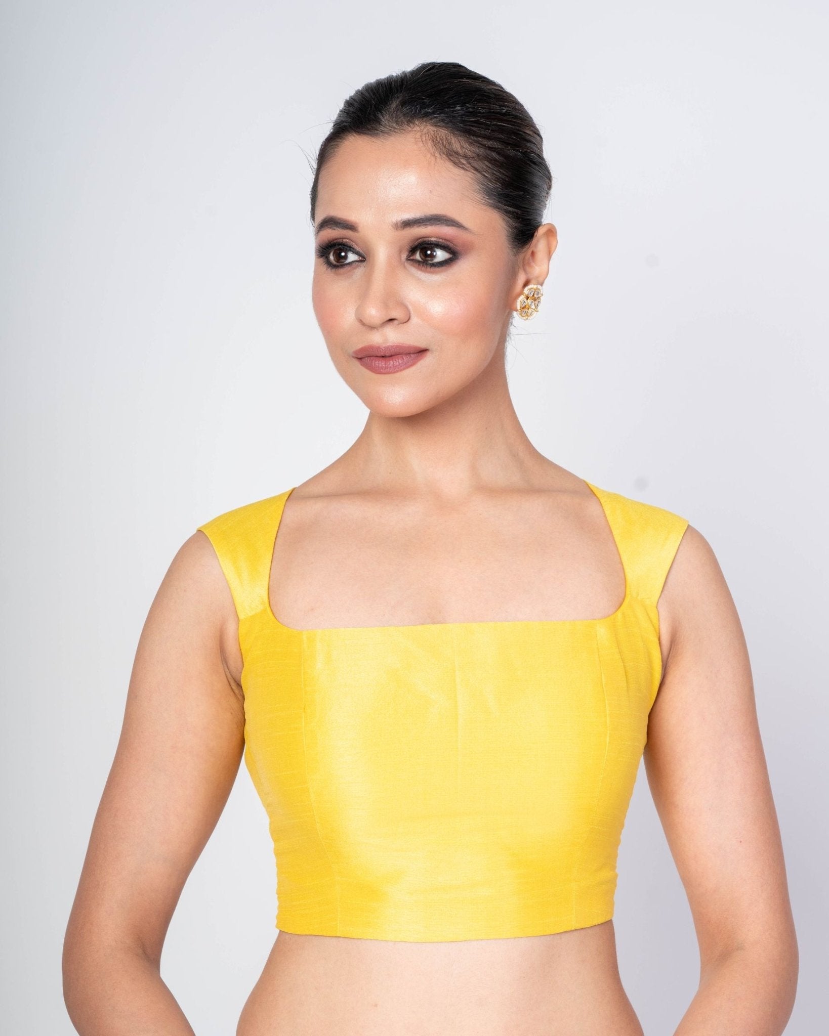 Brighten your ethnic wardrobe with this Yellow Broad Square Neckline Blouse featuring a graceful round back closer and timeless appeal. Designed to flatter modern silhouettes, this statement neckline blouse highlights the collarbone beautifully while offering structured elegance. The broad square neckline adds a contemporary touch, balancing tradition with trend, making it perfect for festive wear, weddings, or elegant daytime occasions.