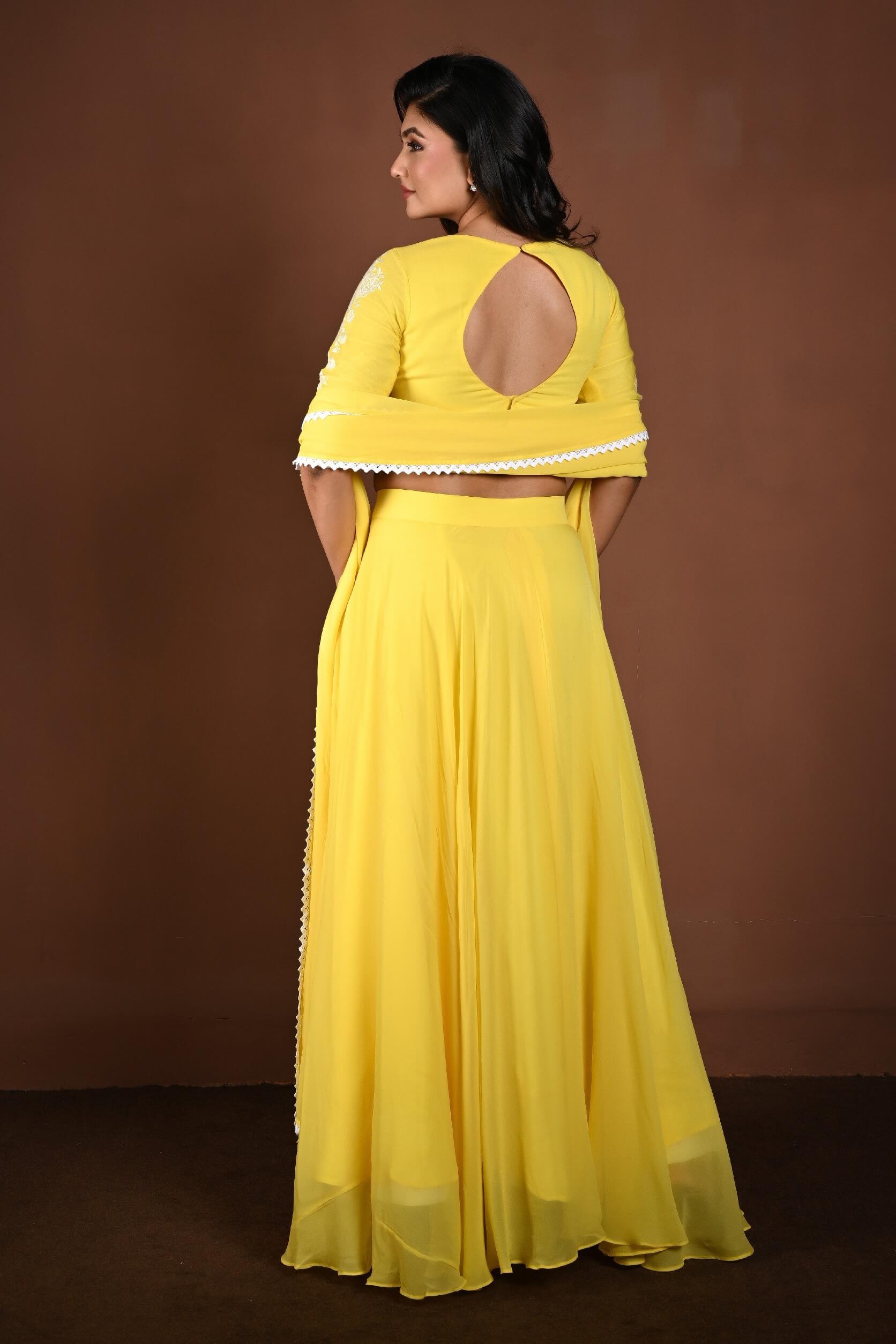 Yellow Georgette Lehenga Set with Embroidered Top with White Lace Dupatta
