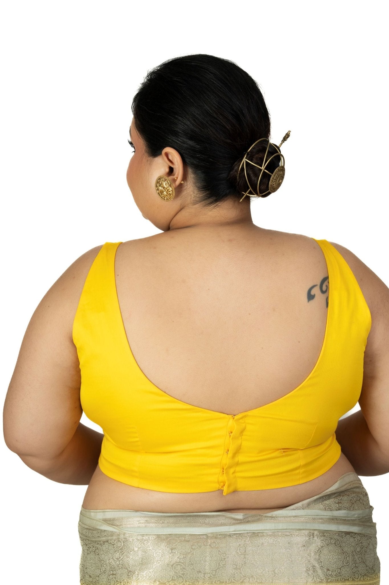 Elevate your ethnic wardrobe with this yellow sleeveless saree blouse, designed for plus-size comfort and style. The elegant square neckline adds a contemporary touch, while the sleeveless cut ensures ease of movement. Crafted to provide a flattering fit, this blouse pairs beautifully with a variety of sarees for occasions where grace and sophistication matter.